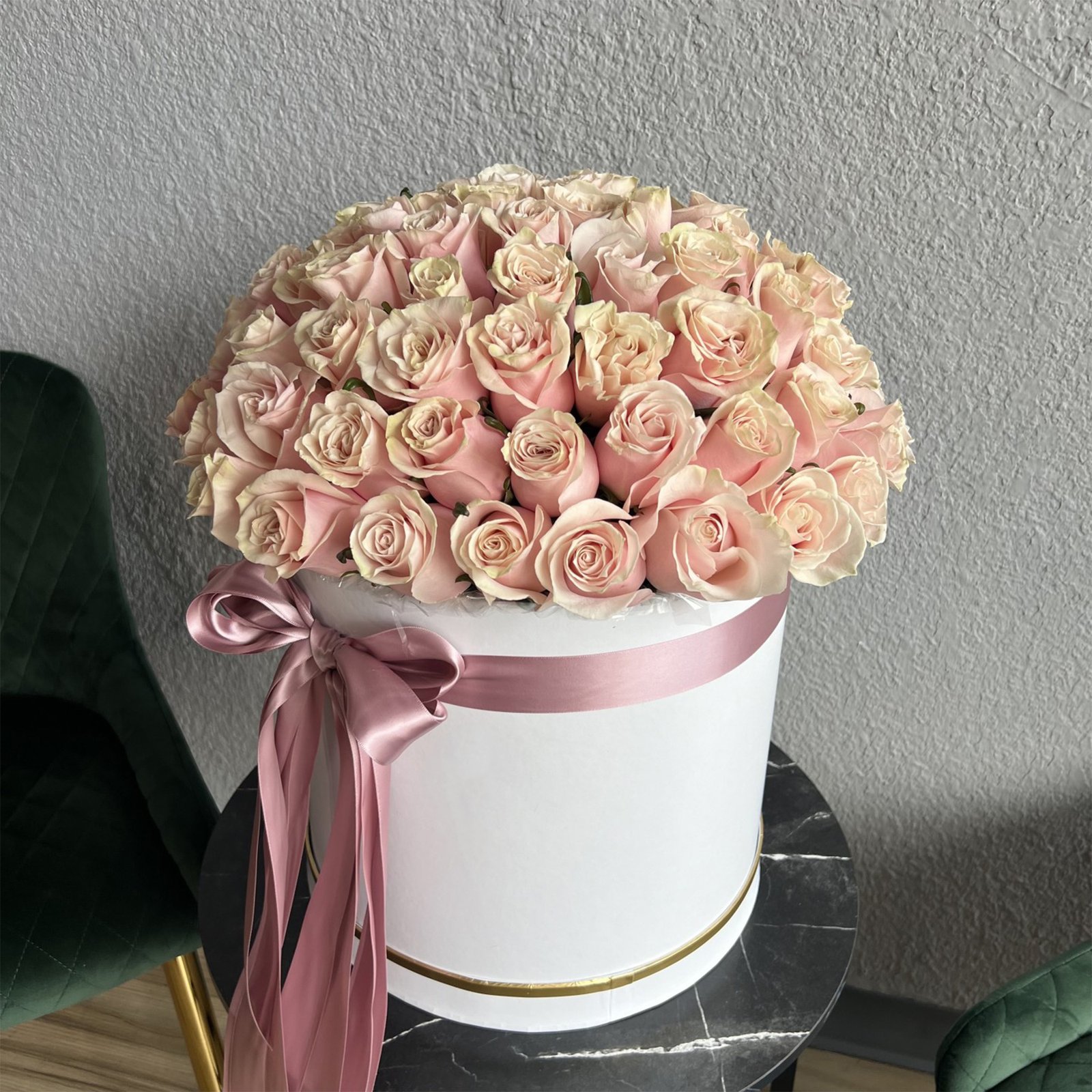 A refined arrangement of soft blush roses, perfectly nestled in a pristine white hat box and finished with a flowing satin ribbon. Gentle in tone yet rich in presence, this piece captures the beauty of understated romance.