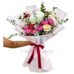 Styled in delicate white wrapping and finished with a deep ribbon accent, this arrangement carries a refined charm that feels thoughtful and heartfelt. Every flower adds its own emotion, creating a bouquet that feels warm, expressive, and full of life.