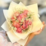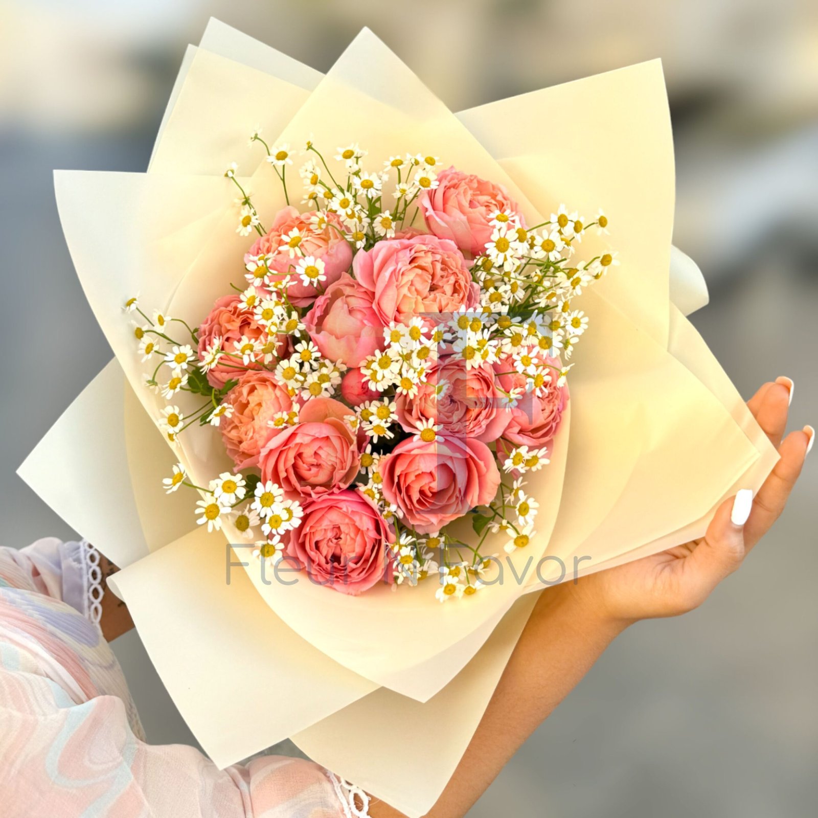 Soft peach pink roses bloom at the heart of this radiant bouquet, surrounded by delicate white chamomile florals and wrapped in warm golden toned paper. Every detail feels like a gentle celebration of love, light, and beautiful beginnings.