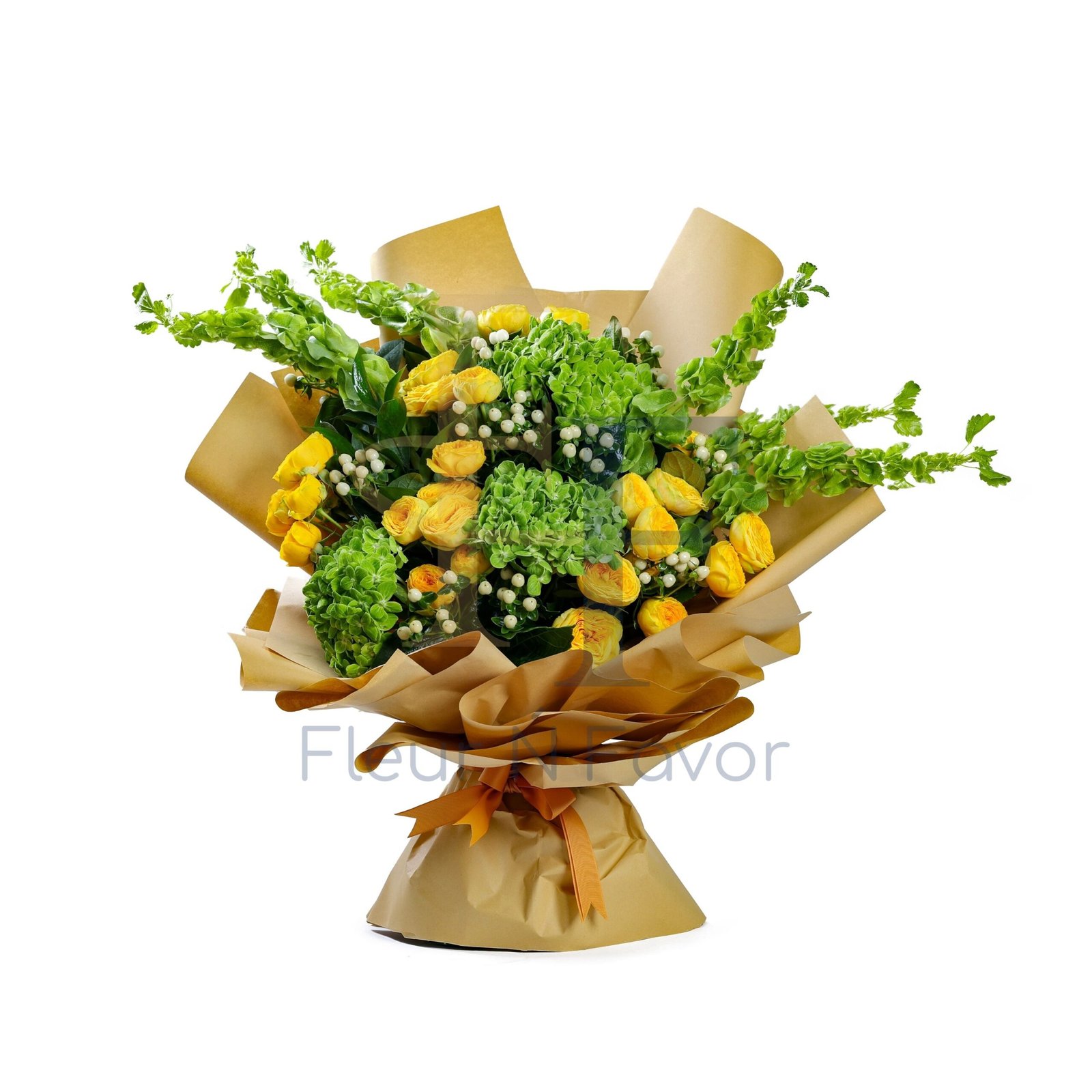 Bright, joyful, and full of life, this bouquet feels like a fresh start wrapped in elegance. Sunny yellow roses mingle with lush green hydrangea and vibrant foliage, creating a composition that radiates warmth and optimism. Wrapped in soft golden paper, it carries a natural charm that feels both uplifting and refined.