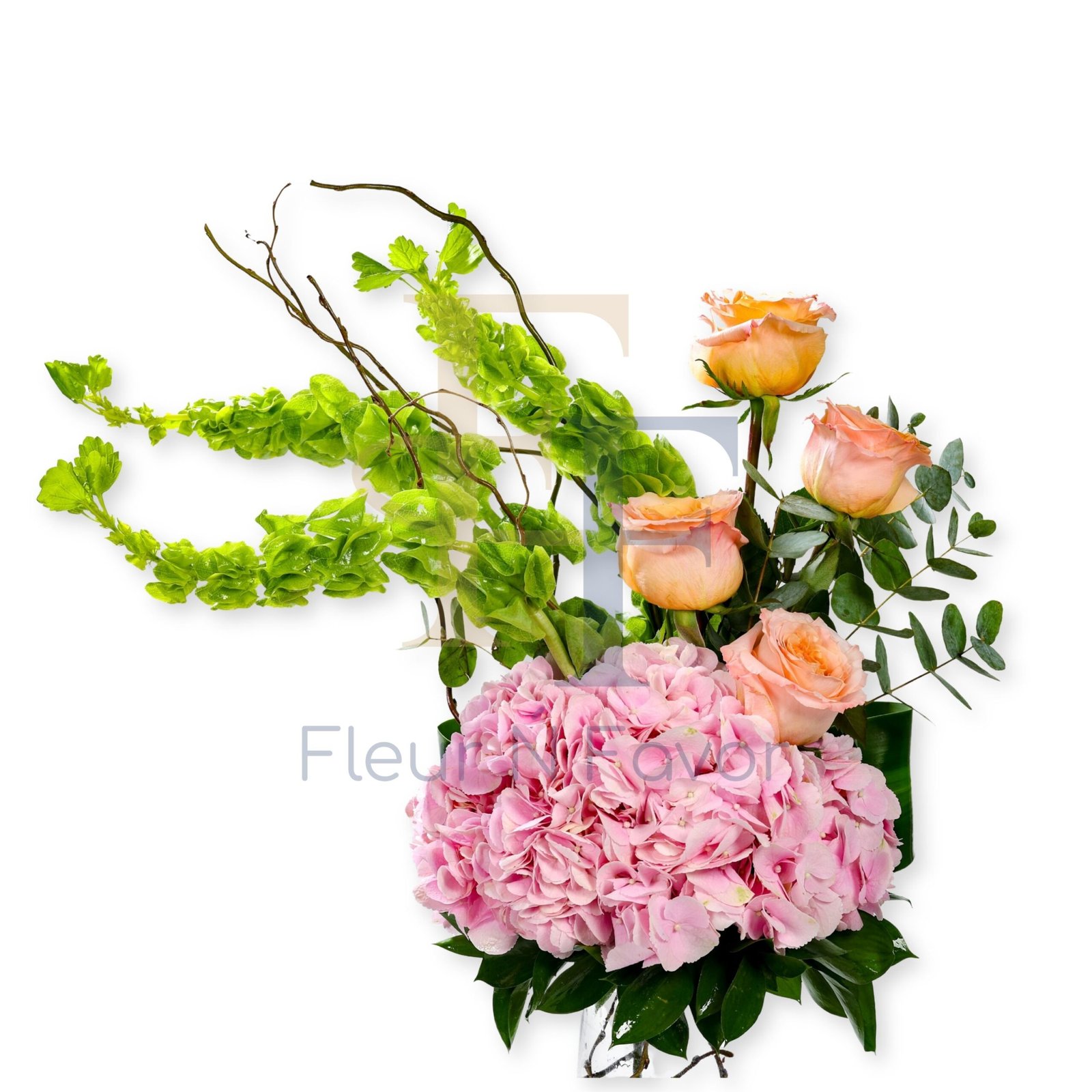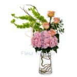 Soft pink hydrangea forms the heart of this arrangement, bringing a sense of tenderness and calm. Paired with gentle peach roses and fresh green accents, the composition feels organic and expressive, like a quiet moment of beauty captured in time.