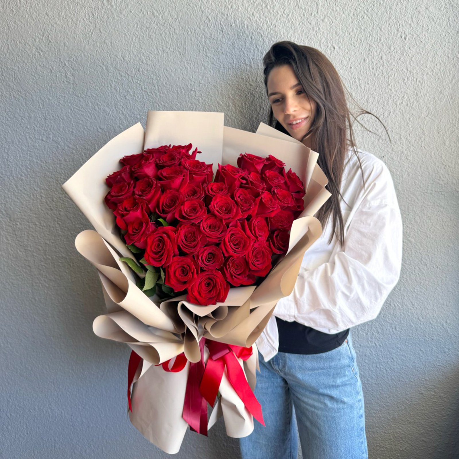Sculpted into the unmistakable silhouette of love, this extraordinary arrangement speaks with undeniable clarity. Each premium red rose is meticulously placed to form a perfect heart, emerging from a dramatic architectural wrap of champagne-toned paper. It is a masterpiece of floral design that transforms a classic symbol into a modern declaration of passion.