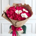 Envelop them in a world of deep romance and unapologetic luxury. This grand statement features a lush sea of velvet fuchsia roses that represent a love both passionate and enduring. The vibrant petals are artfully contrasted by the ethereal touch of pure white orchids, adding a layer of sophisticated grace to this overflowing masterpiece.