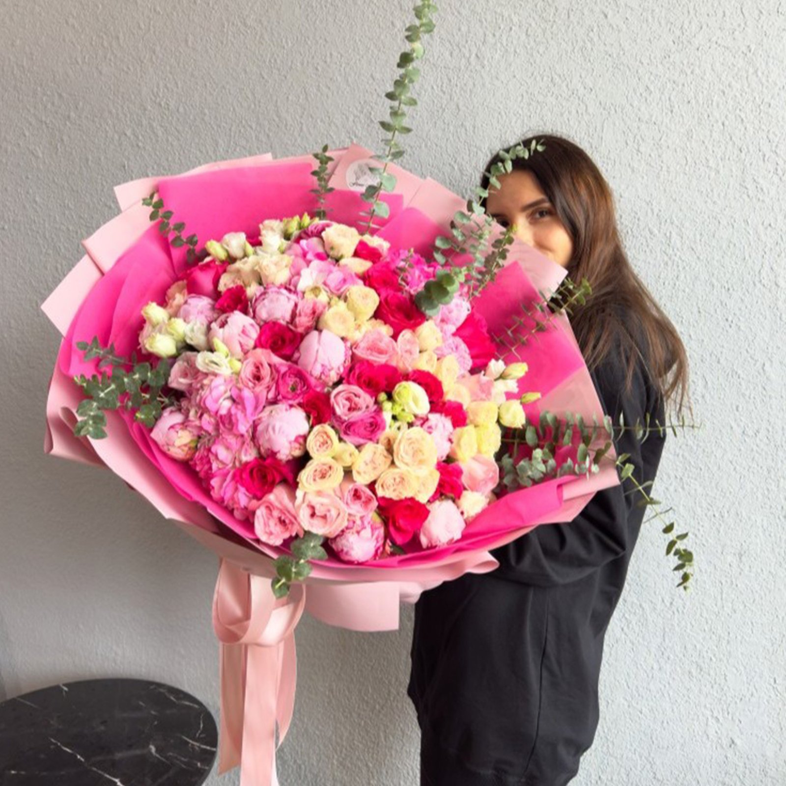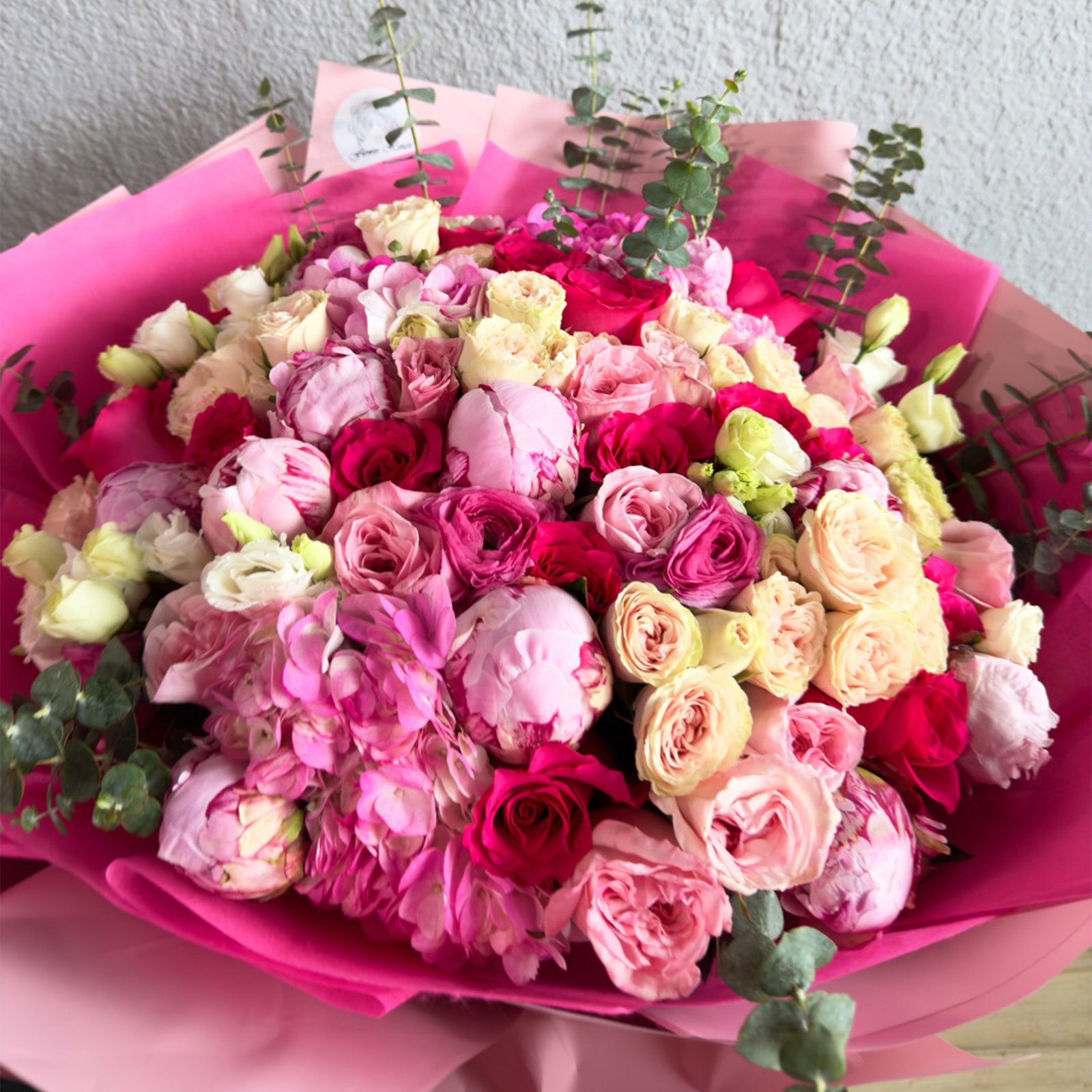 A breathtaking explosion of joy, this oversized bouquet is a celebration of life’s most vibrant moments. Featuring a rich tapestry of garden roses in shades of raspberry, fuchsia, and buttercream, the arrangement is layered with delicate eucalyptus sprigs that add a modern, airy dimension. Wrapped in dramatic, architectural layers of hot pink and blush paper, it is a gift designed to leave the recipient utterly speechless.