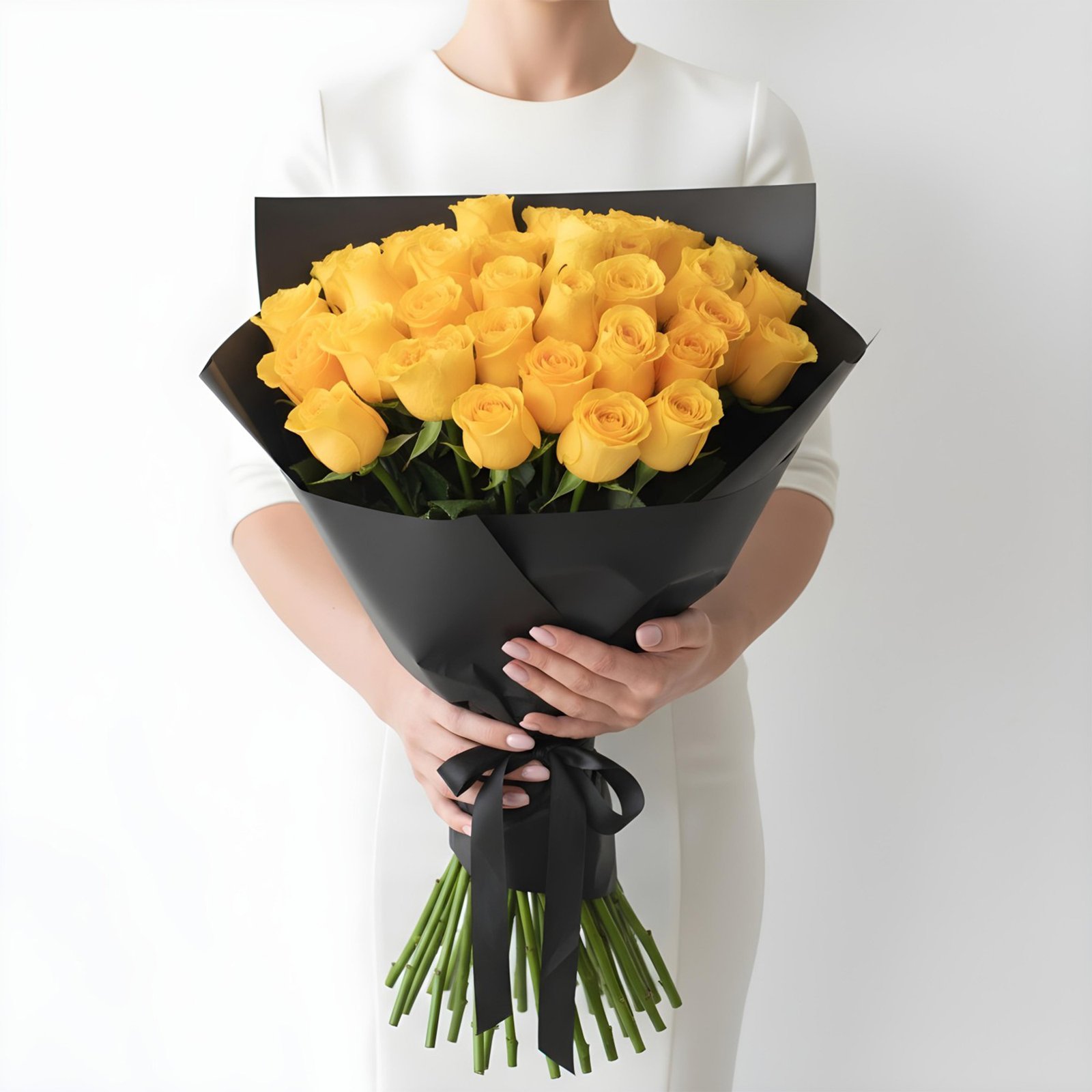 Ignite a sense of pure joy with this striking collection of sun-drenched golden roses. Each bloom is hand-selected for its vibrant saturation and flawless form, representing the warmth of a thousand suns captured in a single gesture. Encased in architectural matte black parchment, the brilliant yellow petals create a high-contrast visual that is both modern and undeniably bold.