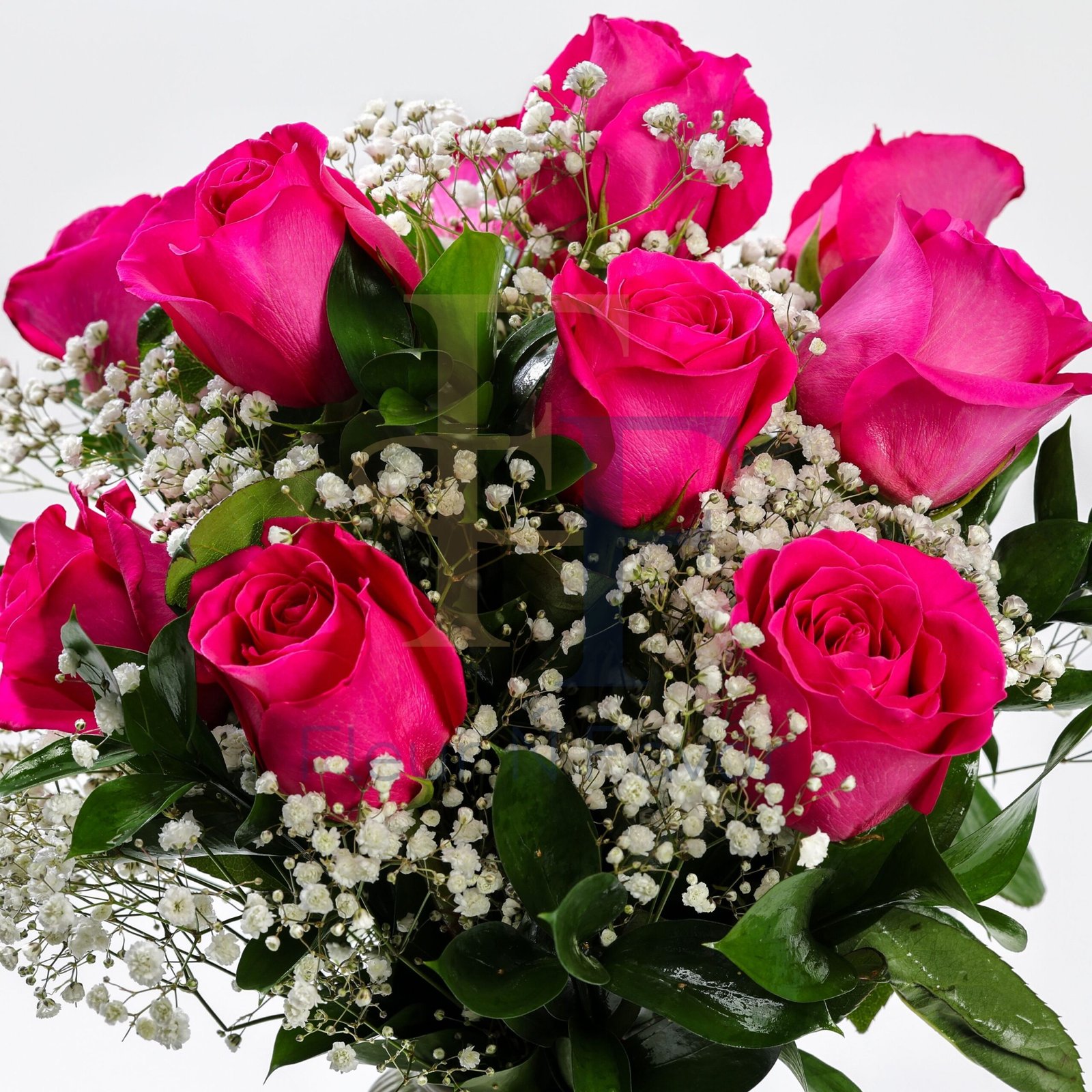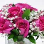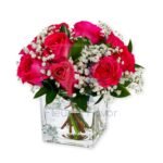 Rich pink roses bloom in perfect harmony, their velvety petals wrapped in softness and depth. Accented with delicate white baby’s breath and fresh green leaves, this arrangement feels classic yet irresistibly intimate. Set in a clear glass cube, it carries a polished elegance that lets the flowers speak for themselves.