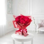 The arrangement is enveloped in translucent ruby-toned architectural wraps that catch the light, finished with a playful duo of pink and red ribbons. This is the ultimate centerpiece for a romantic evening or a high-fashion surprise that demands attention. When you want to say everything without saying a word, let this radiant display lead the way.